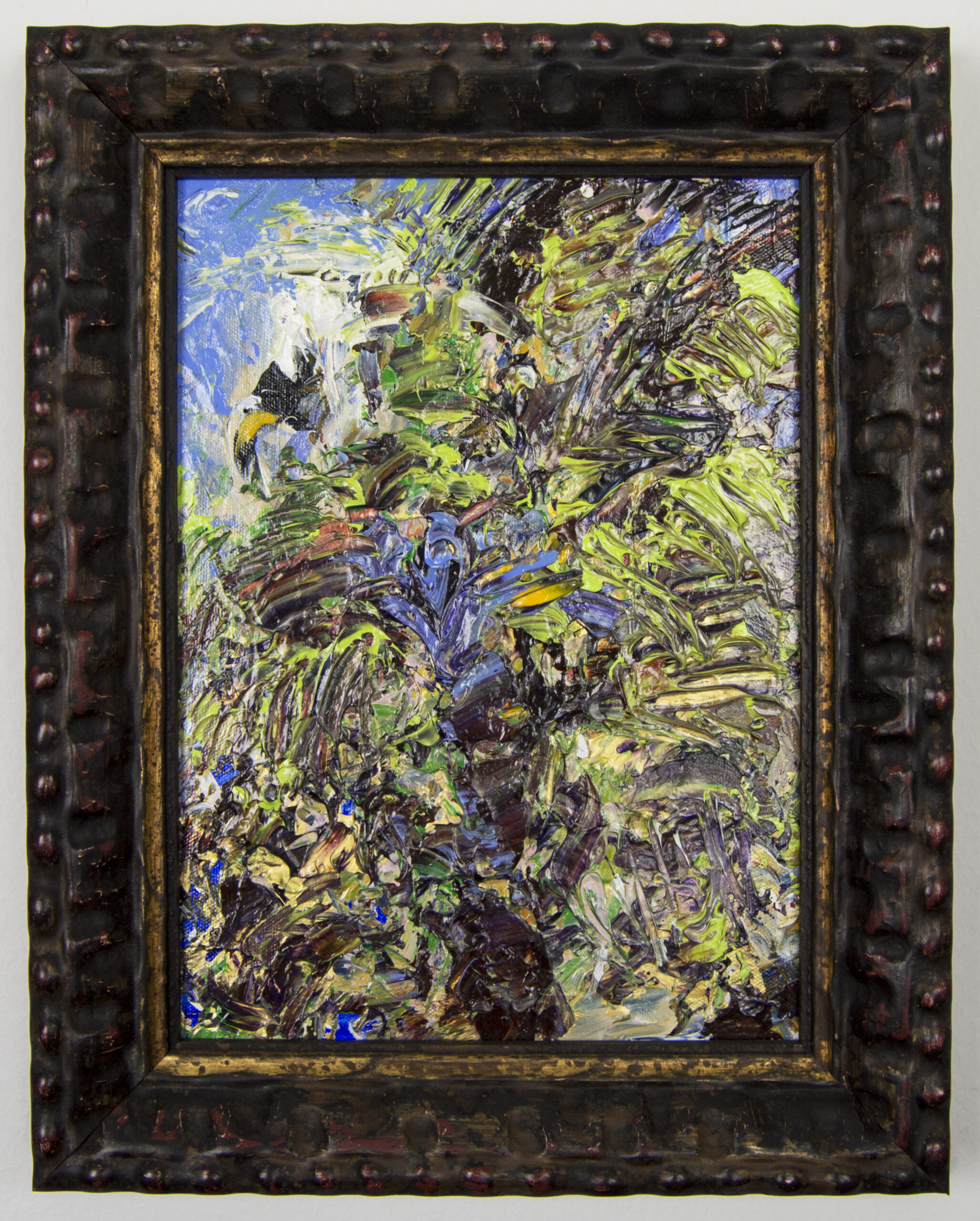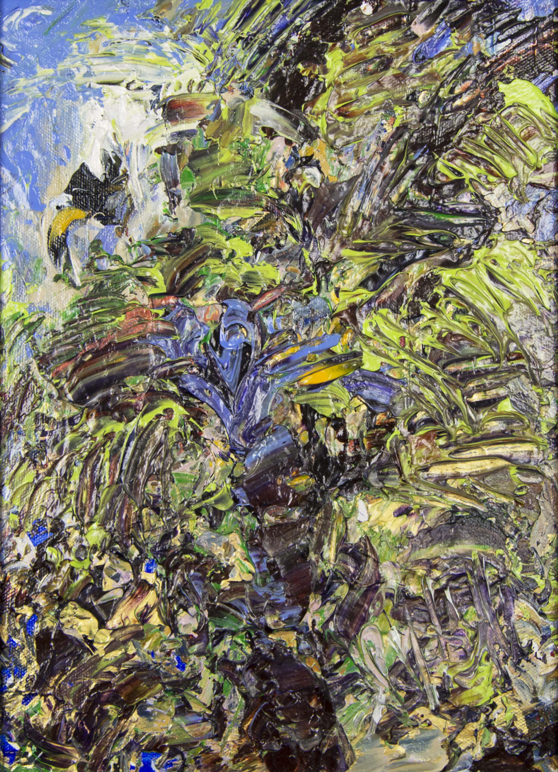 15 3/4 x 12 3/4 Acrylic on canvas created with palette knife. This piece also has a great deal of texture, and really became something of its own. I call it “Lost One” referencing the bird sitting in the palm tree at the top of the painting. The bird is lost, but also found. The bird is lost and away from its flock, but also safe in paradise.